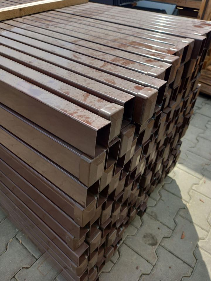 W ofercie na sprzedaż słupki ogrodzeniowe na wysokość 2 mb lub 2.30 mb w kolorze brązowym lub grafitowym w zestawie z plastikową zaślepką na szczyt słupka, zabezpieczającą przed dostawaniem się wody do środka słupka.