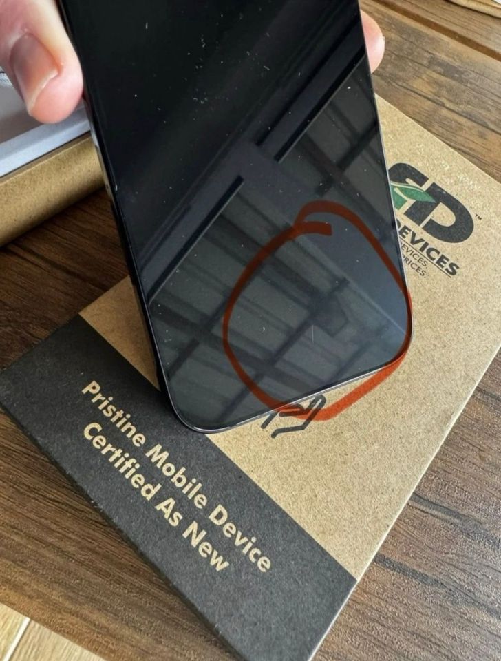 Sprzedam iPhone'a 16 Pro Max. Telefon ma niewielką rysę na ekranie, widoczną na zdjęciu, ale działa bez zarzutu.