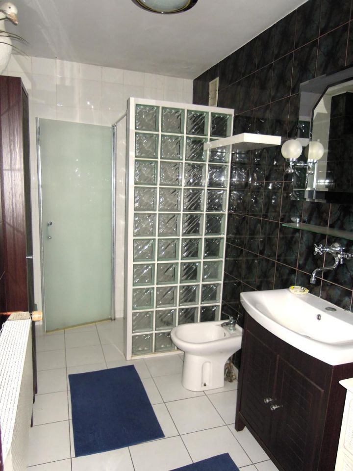 Na półpiętrze jest jadalnia z balkonem oraz salon z kominkiem i z balkonem, na piętrze zaś dwa pokoje, duża łazienka z wanną i oknem.