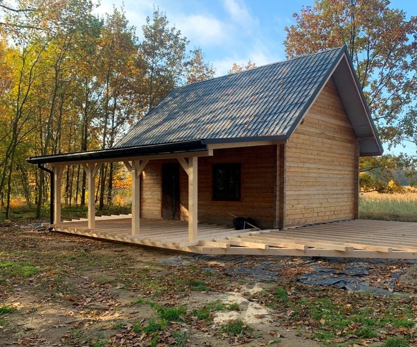 Przedmiotem sprzedaży jest drewniany budynek o pow. 35 m2 z użytkowym poddaszem, niepodpiwniczony, wybudowany w grudniu 2022 roku z drewna świerkowego (belki 10x10), posadowiony na działce o pow. 14 ar.