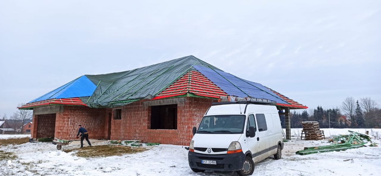 Na działce znajduje się dom w stanie surowym otwartym, wybudowany według projektu Padme 2. Budynek posiada więźbę dachową pokrytą membraną – brak dachówki, co daje nowemu właścicielowi możliwość dopasowania wykończenia według własnych preferencji.