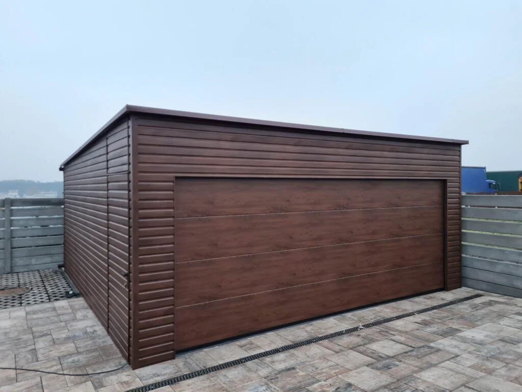 Całość została wykończona w eleganckim kolorze orzech, który nadaje garażowi naturalny i estetyczny wygląd. Z przodu znajduje się szeroka brama segmentowa 500×200 cm w kolorze orzech, gwarantująca wygodny i bezpieczny wjazd. Dodatkowe drzwi 100×190 cm ułatwiają wejście bez konieczności otwierania bramy.