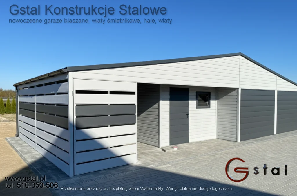 Ściany zostały wykonane z blachy w kolorze białym RAL 9010, z poziomym układem blachy, co nadaje całości nowoczesny i uporządkowany wygląd. Garaż wyposażony w dwie bramy uchylne 276×190 cm w kolorze antracyt mat czyli 7016 mat umożliwiają zaparkowanie dwóch samochodów., Dwa okna 80×60 cm także w kolorze antracyt mat 7016 zapewnia dopływ naturalnego światła.