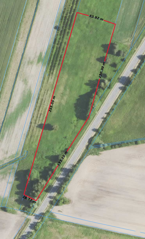 Sprzedawana działka ma kształt nieregularny, zbliżony do prostokąta o wymiarach: 257m długości x 53m szerokości w najszerszym miejscu, a w węższym miejscu 30 m.