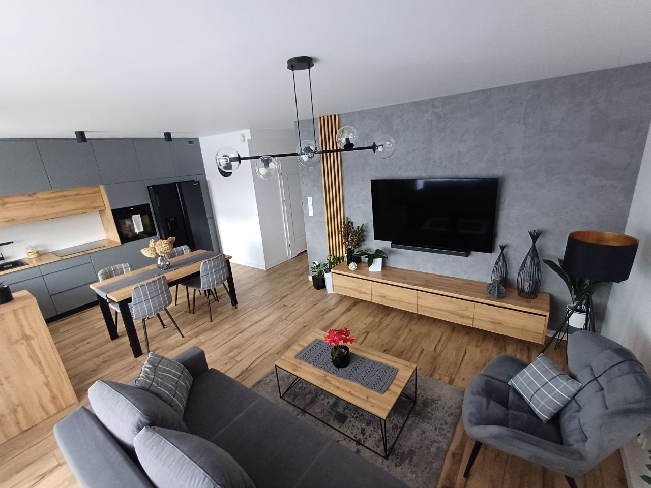 • przestronny, jasny salon z aneksem kuchennym,
