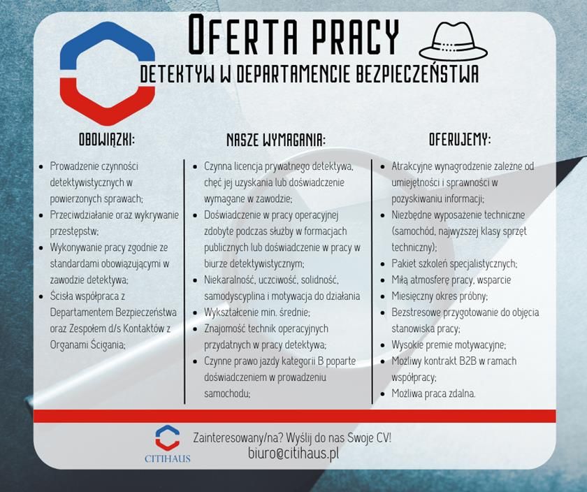 -Czynna licencja prywatnego detektywa, chęć jej uzyskania lub doświadczenie wymagane w zawodzie;