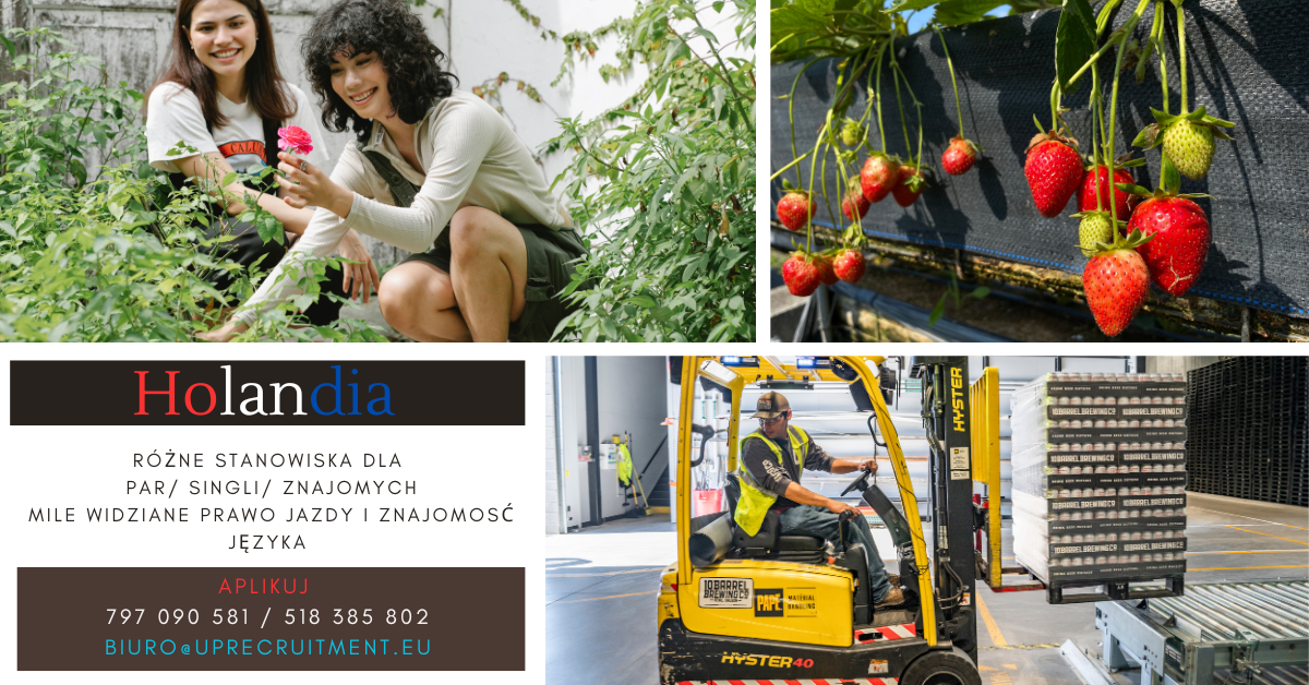 Up Recruitment ( KRAZ 13887) poszukuje osób zainteresowanych wyjazdem do pracy na terenie Holandii. Posiadamy wiele ofert pracy min. szklarnie z kwiatami/ owocami oraz sortownie owoców gdzie rekrutujemy osoby bez znajomości języka i doświadczenia. PARY ZAWSZE MIESZKAJĄ RAZEM,