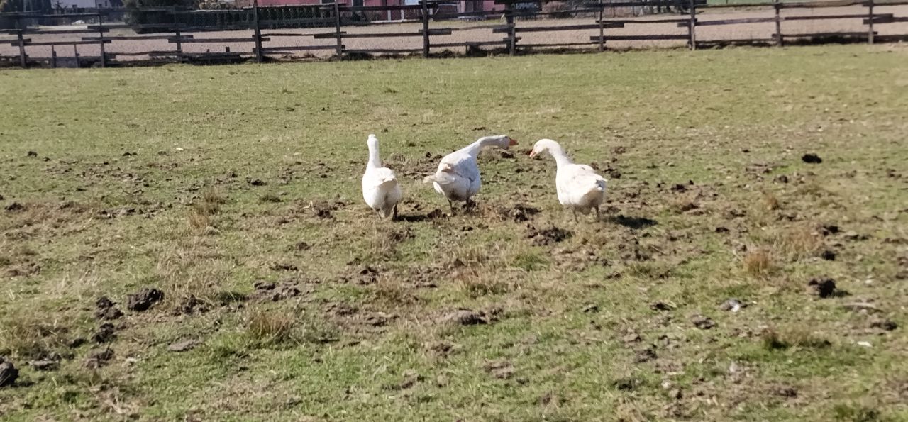 Mam do sprzedania niespokrewniony komplet gęsi białych 2025 (1 gąsior, 2 gąski)